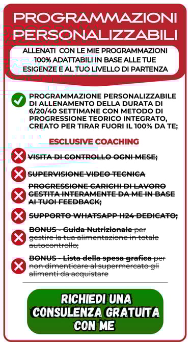 Non ti affido a mode, promesse vuote, metodi truffaldini o falsi miti alimentati da Tik Tok. Mi baso su ricerche in ambito di allenamento e nutrizionali comprovate, studiate e perfezionate, per offrirti il meglio in termini di sicurezza ed efficacia. Il mio obiettivo è farti ottenere risultati concreti in modo sano e sostenibile.
