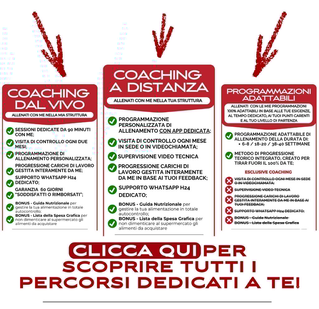 Se pensi che con 4 allenamenti al mese da 20 minuti, allenamenti con elettrostimolatori o metodiche rivoluzionarie che di rivoluzionario non hanno un bel niente, tu possa cambiare la tua condizione fisica, non sei nel posto giusto. Quelle sono metodiche truffaldine da cui io prendo completamente le distanze. Pensaci! Se fosse cosi semplice, tutti intorno a noi avrebbero il fisico dei loro sogni, ma, come ben puoi notare, non è cosi...